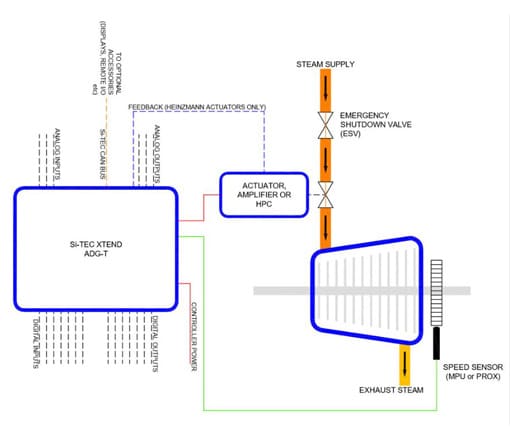 Le Si-TEC Xtend ADG (régulateur numérique avancé) est un système de régulation pour turbines à vapeur conçu pour les applications d’entraînement mécanique (pompes, compresseurs, ventilateurs, broyeurs, etc.). Développé initialement en 1991, il s’est depuis imposé comme la référence en matière de régulation de turbines à vapeur. Grâce à ses nombreuses fonctionnalités et à sa large gamme de régulateurs PID de vitesse, le Si-TEC ADG est devenu le choix standard pour de nombreux exploitants de turbines à vapeur. La gamme de régulateurs numériques intégrés Si-TEC est reconnue internationalement pour son niveau de contrôle optimal et pour une large gamme d’applications, notamment les turbines à vapeur et les moteurs alternatifs (diesel ou essence).